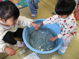 南極の氷に出合って以来、氷への関心が高いみんな。昨日から水をいろいろな型に入れておいたところ… やった!氷ができた! 触ったり、眼鏡のレンズのようにして氷越しに向こう側を見たり、今日 …
