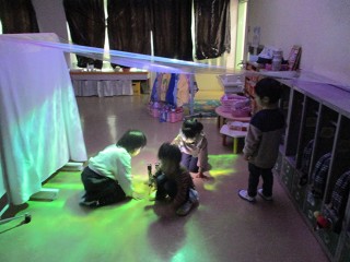 子どもたちにとって、何かのつもりで遊ぶとき、すぐにそこが水の中になったり森の中になったりして、楽しい世界が広がっていきます。楽しい世界に浸って。今日も夢中で遊んでいました。 ここはオーロラの見 …