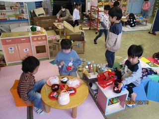 今日は少し春らしい日の光が差し込みました。今日もみんなはいっぱい楽しみました。 たくさん遊んだ後の給食・・・今日はデザートが! …