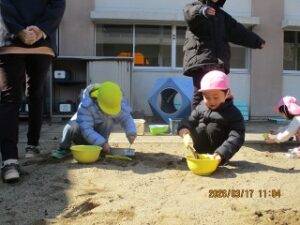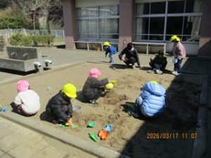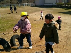 明日は、西幼稚園の第50回修了証書授与式です。今日はいいお天気になったので、お外に行き、みんなで年長さんとの時間を楽しみました。