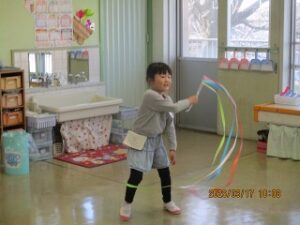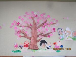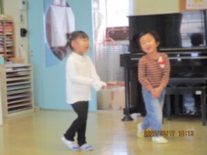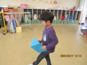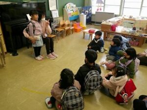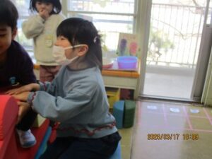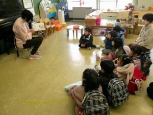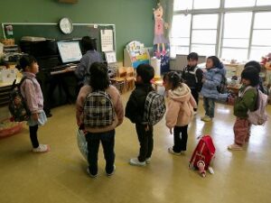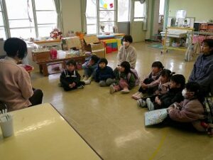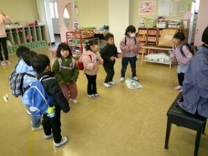 お帰りの時間になりました。明日はいよいよ修了式、というお話を先生から聴きました。そして、年長さんが小学校に行っても「ともだち」というお話も。年少さんと年中さんはじっとそのお話を聴いていました。