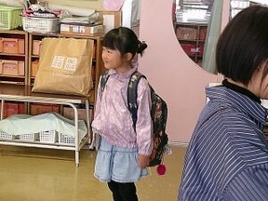 降園の時間が来ました。年長さんがリュックをかついでくるのは今日が最後。年長さんもいろいろな思いがあるようでした。