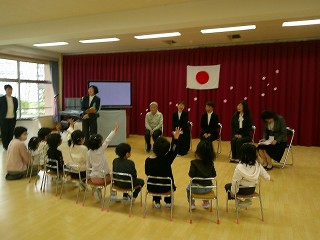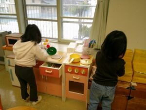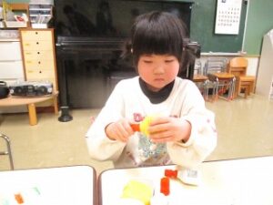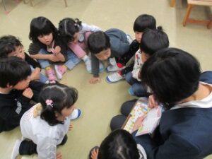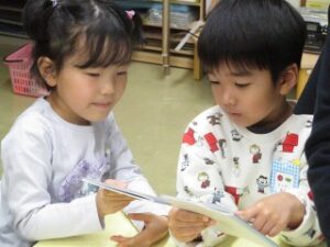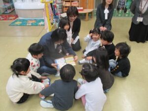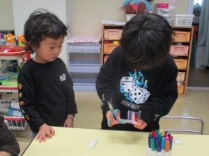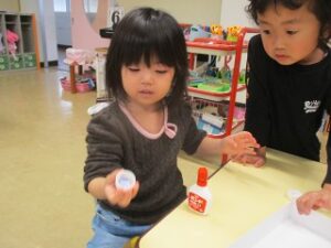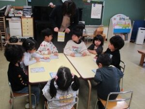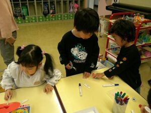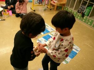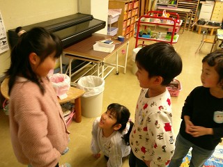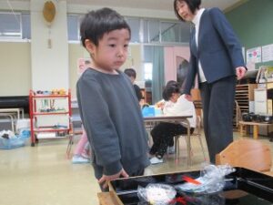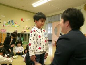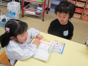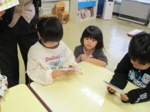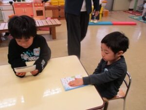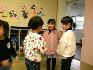 今日は午前でお帰り…とそのとき、お帰りの時間の少し前に3月まで年長さんだったお友達が来てくれました。すると、みんなは、新しい名札をもらったことをうれしそうにはなしてました。
