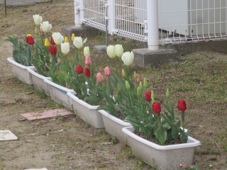 秋にみんなが植えたチューリップが咲き始めました。「みんな進級おめでとう!」って言いながら!