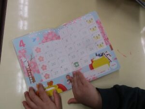 そして、年長さんになったお友達は、これまであこがれだった「出席シール帳」を先生からもらいました。3月まで、年長さんが毎朝カレンダーを見て、出席シールを貼っているのを見て、いいなあとみていたみんな。ついに、年長さんになり自分もシールを貼れるとあって、とても喜んでいました。