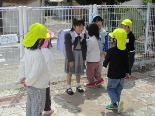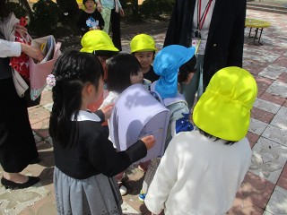 給食の前、入学式を終えた大好きなお友達が立ち寄ってくれました。みんなは1年生になったお友達のランドセルがとても気になった様子で…