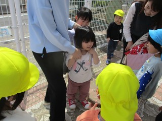 ちょっとだけ、順番にかつがせてもらいました。思っていたよりも重くて、うしろにひっくり返りそうなお友達もいました。