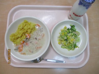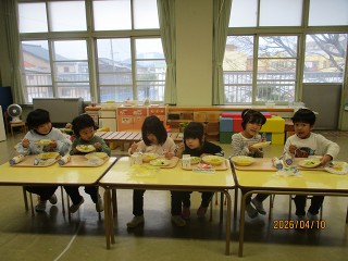 入園式が終わって、大好きな給食の時間。年中さんと年長さんは今日もおいしくいただきました。