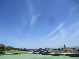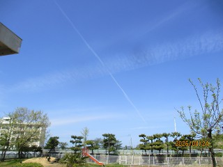今日は快晴。空には、たくさんの飛行機雲が交差したり、おもしろい形の雲が浮かんだりしていました。時折空を見上げては「あの雲おもしろい!」と話すお友達がいました。