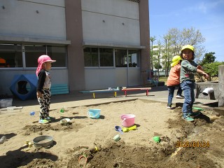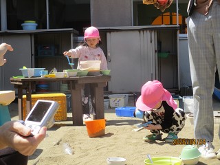 今日は水道を1か所だけ使えるようにしておきました。子どもたちが砂遊びをしていて、水が必要になることを見越して。なぜ1か所だと思いますか?それは、大量の水を使う気候ではないことや、何よりもお友達と一緒に順番やルールを考えて使ってほしいという願いがあったからです。さあ、子どもたちはどう使うかな?と見守っていると…。