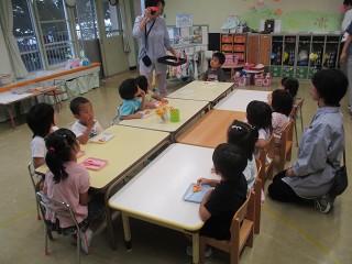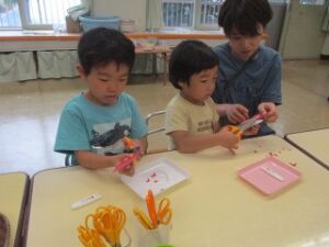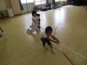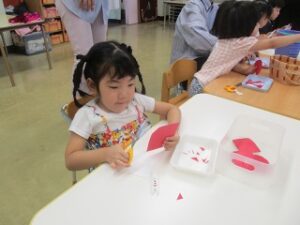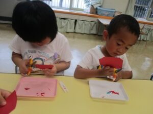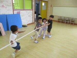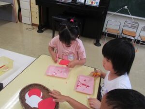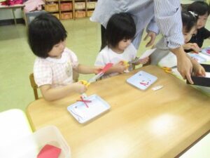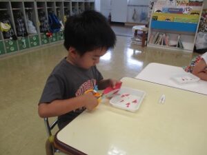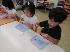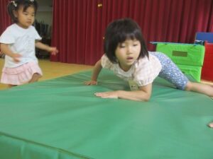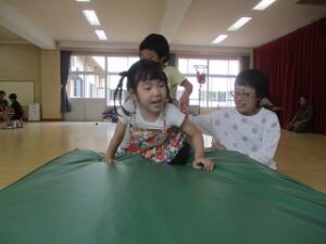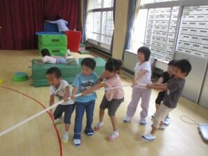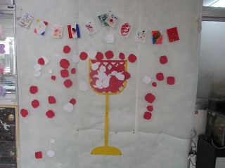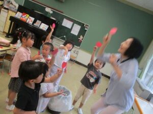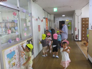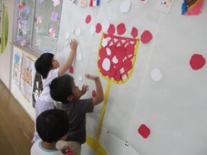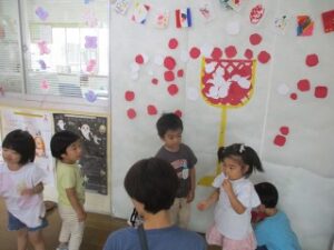 運動会がとても楽しみなみんな。万国旗を見て、自分たちで好きな模様の旗を作って飾ってあります。そして今日、先生たちが玄関に玉入れのかごを飾りましたが・・・「あれ?玉がない!」
