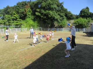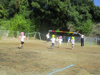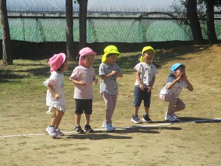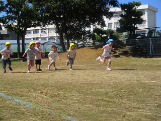 よ~いどん!年長さんは毎日タイムを測定。年長さんが走るときになると、年中さんも年少さんも集まってきます。