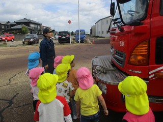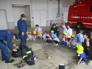 ワクワクがいっぱいのみんな。どんどん知りたいこと、聴きたいことを消防士さんに聴いていました。また、知っていることをうれしそうに話すお友達もいました。