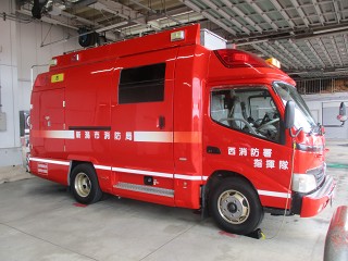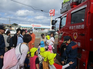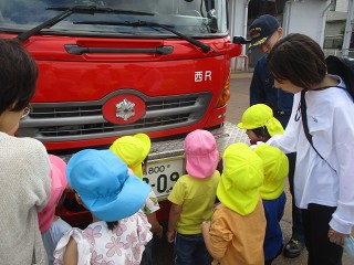 車が大好きなお友達が西幼稚園にはたくさんいます。遊びの中でもいろいろな車の話題が出てきます。保育室にある消防車の絵本を手にとって、いろいろな種類の消防車について研究?しているお友達もいます。今日は、みんなで消防署に行き、本当の消防車を見に行ってきました。