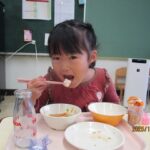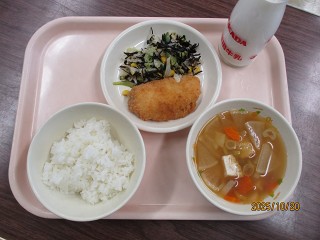 今日の給食は…ごはん、大根汁、鮭チーズフライ、ゴマ入りひじきサラダ、ぎゅうにゅう。