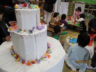 こんなに大きなケーキが!みんなで作っています。先日のお誕生会で先生が作った仕掛けのあるろうそくに興味をもち、今度は自分たちが幼稚園のために何本も作っているお友達もいます。飾りのお花を作るお友達も。そして、オリジナルの歌も製作中です。幼稚園はきっと喜んでくれることでしょう。