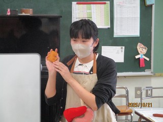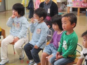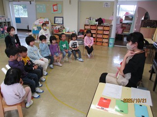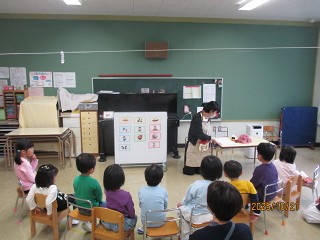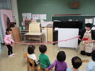「みんなの体の中には、こ~んなに長い腸が入っているんだよ」それを聴いて、思わずみんなは自分のおなかをさわっていました。