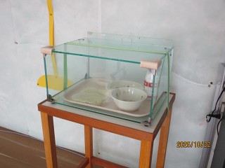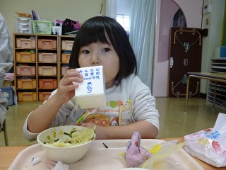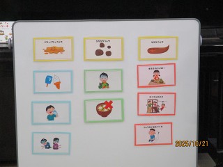 給食ができると、その日の給食が飾られます。みんなは、そこを通ると「今日は何かな?」と覗き込んでは「やった~!今日好きなのがある!」とお話しています。