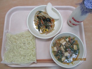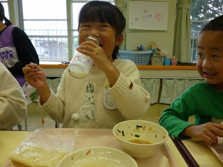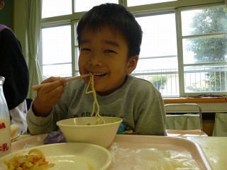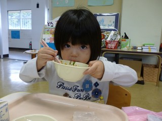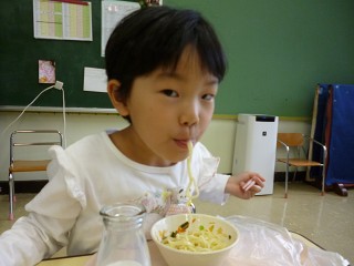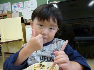 ちなみに今日の給食は…中華麺、マーボー汁、ゴマ入り中華サラダ、梨、牛乳でした。マーボー汁のいい香りが幼稚園中に広がっていました。