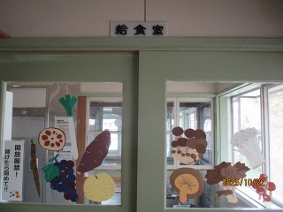 さて、ここからは、西幼稚園の給食についてお伝えします。上の写真は西幼稚園の給食室の入り口です。ここには、小学校と兼務をしている栄養教諭の先生手作りの季節の飾りがあります。いつも旬の野菜や魚、果物などが飾られているんですよ!子どもたちも給食のワゴンを返しに来た際に見ています。