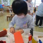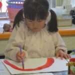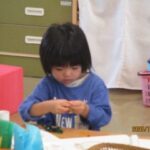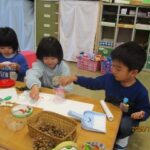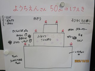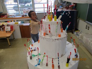 幼稚園の50歳のお祝いに、ケーキ作りをはりきってがんばるみんな。みんなで考え、みんなで作るケーキに、ろうそくをつけています。子どもたちは50歳だから、50本必要と考えました。