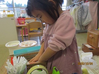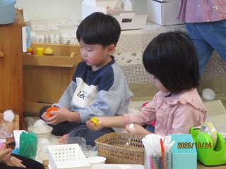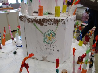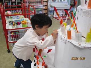 別のお友達はケーキに何かを書いていました。幼稚園が喜ぶことを思いついたようです。