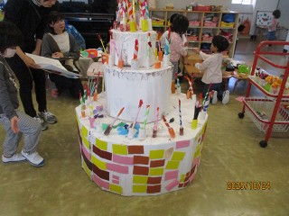 創立50周年の記念式典(幼稚園のお誕生会)に向け、ケーキにたくさんの飾りを作っているみんな。ろうそくは50本!と言っていましたが、昨日の段階では「あと4本」と言っていました。そして今日…ついに…!!!!