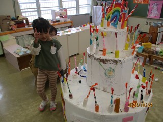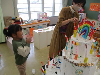 そして、別のお友達は、得意な虹を書いてケーキに飾りました。飾ってみると、それはそれは素敵で…!!思わず飛び跳ねちゃいました。