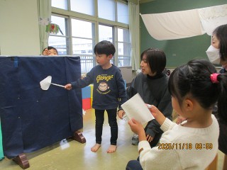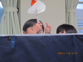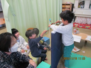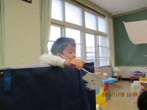 先日、年長さんが誕生会で見せてくれた手作りのペープサートがきっかけで、年中さんや年少さんも遊び始めました。年長さんがお話を語り、年中さんと年少さんが自分たちでペープサートを動かしていました。