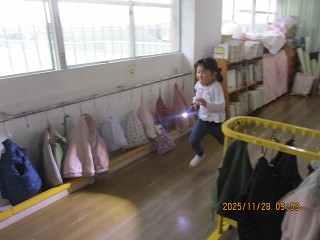懐中電灯を手にし、いろいろなものに光を当てる姿も。