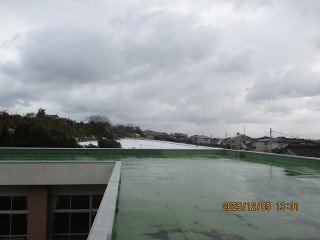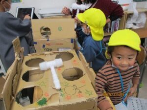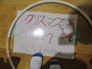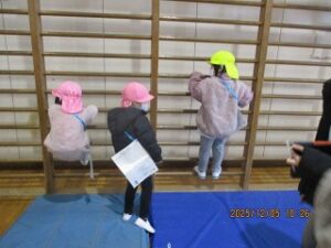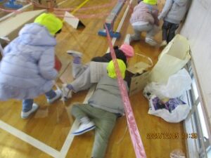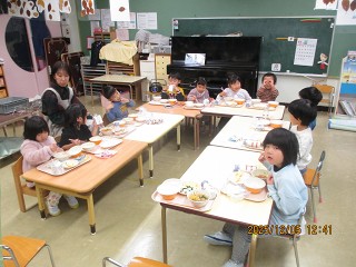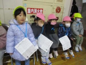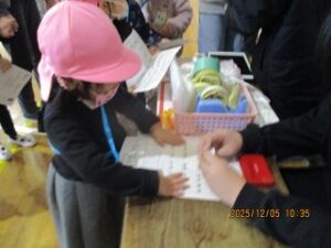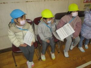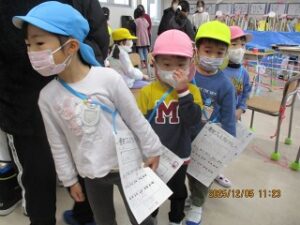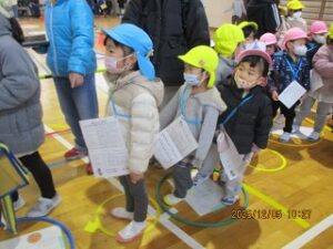今日は雪がうっすらと積もりました。幼稚園の周りの畑も屋根も白くなりました。そんな中でしたが、今日は小学校の「あおぞらフェスティバル」に招待していただき、みんなで歩いて行ってきました。