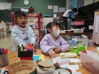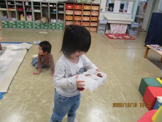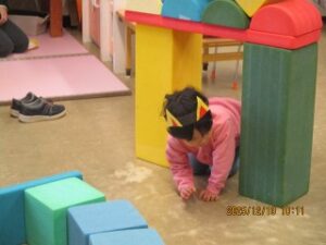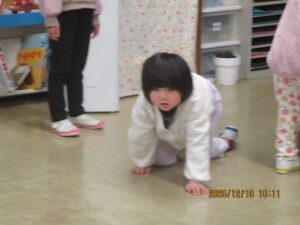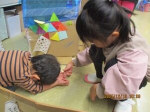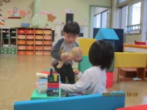 最近、何かになりきって、その世界に浸って遊ぶ姿がたくさんあります。猫ちゃんになったり、飼い主になったり、サンタさんもときどき登場したり。その世界の中で、そのものらしくお話したり動いたりすることを楽しんでいる姿がたくさん見られます。