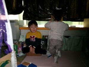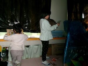 暗~いお部屋で「あっ!サンタさんからプレゼントが届いている!」自分たちのお家でプレゼントをもらったつもりを楽しんでいます。サンタさんやトナカイになっているお友達はその様子をうれしそうに見ています。プレゼント作りが楽しいお友達も!