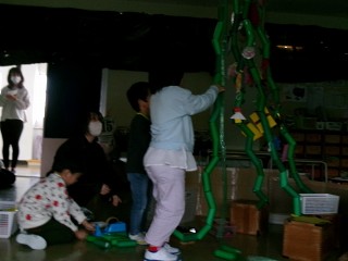 (暗くてすみません)真っ暗にしている部屋でもくもくとツリーを作るお友達。