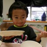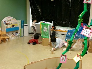 おさえていないと、下に落ちてしまう、さてどうしたものか。そんなときは、声を掛け合って。決してあきらめず、友達と力を合わせていました。