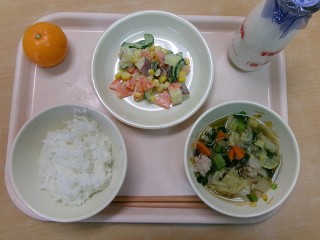 今日は、新潟市西区の特産サツマイモ、「いもジェンヌ」を使った西区一斉の「いもジェンヌ」給食の日。いもジェンヌサラダはとてもおいしかったです。