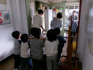 給食後、いつもこうして給食室へ先生と一緒にワゴンを運びます。