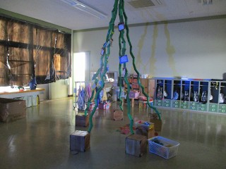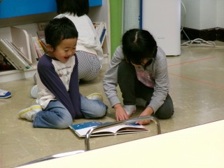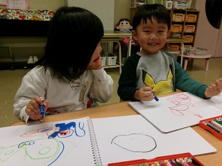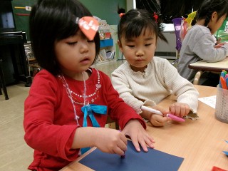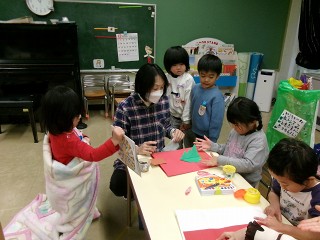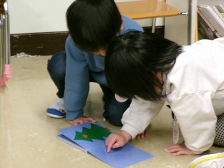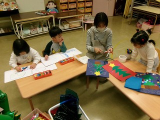 そして、お友達と一緒に休息の時間。絵を描いたり、絵本を見たり、今日はクリスマスのプレゼントを入れる袋を作っていたお友達もいました。