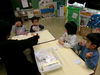 そして、年中さんと年長さんは今日はフッ化物洗口の日。ブクブクうがいがとても上手です。すぐそばにいる年少さんもその様子を見て、ちょっとあこがれています。