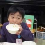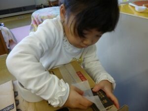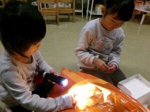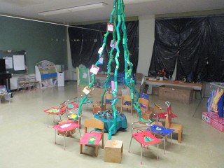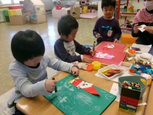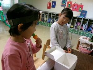 みんなのクリスマスツリーの周りには、それぞれが作ったプレゼントを入れる袋が!そう、来週22日はクリスマス会。いつもなら、この会をしているころに幼稚園の近くにサンタさんが来ていることが多い?ので、もしかしたらサンタさんが来てくれるかもしれないと、みんなでお帰りの前に準備しました。