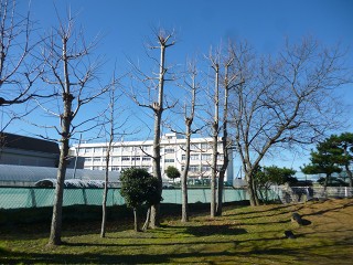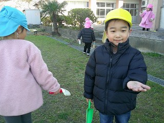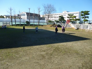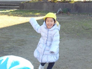 園舎が影になって、そこがお昼過ぎまで凍っていたのです。でもお日様が当たる場所はあたたかい!