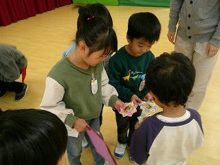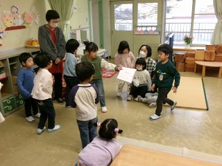 園長先生は遊戯室に(隠れて)いました。無事に見つけることができ、「今年は何年でしょうか?」という最後の問題もクリアし、園長先生から、それぞれの写真つきの「ワクワクがいっぱいになるお守り」を受け取りました。