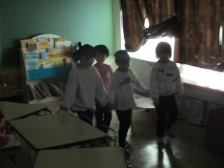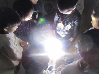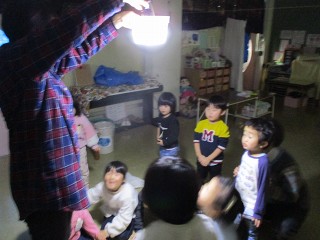 部屋を暗くすると、そこはもう南極!子供たちは、急に1列になって