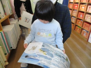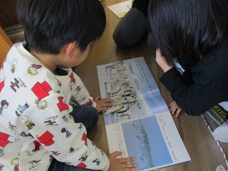 昨日、南極の氷に出合ったみんな。今日、南極と北極の本を先生と見つけて夢中に。