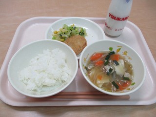 さて、今日の給食は、メンチカツ!みんな大好きな味噌ワンタン汁も!