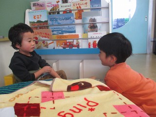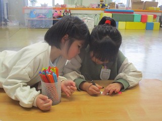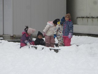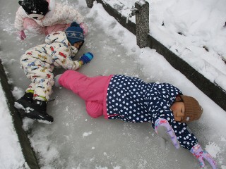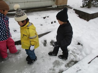 午前中は気温が下がりましたが、晴れ間もありみんなで園庭へ。今日は雪、氷ともにコンデション良好!