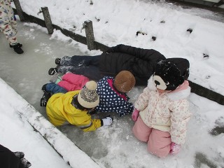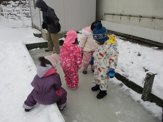 「おお~今日も壊れないよ」「え~本当に大丈夫?」氷の上に恐る恐る上がるお友達、勢いよく上がるお友達、みんなが上がったのを見てから慎重に上がるお友達。