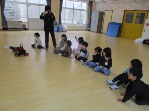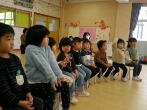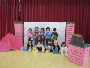 この後、先生たちの「ももたろう」の劇を見ました。子どもたちはおなかをかかえて笑っていました(演じている私たちも笑いが止まりませんでした)