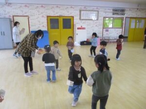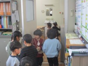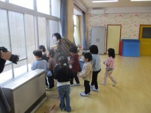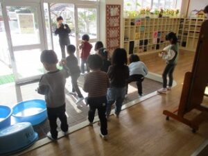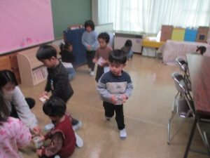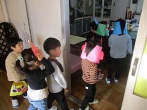 職員室、園長室、そして保育室など幼稚園中で豆まきをしました。