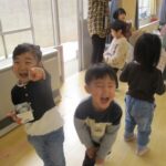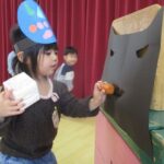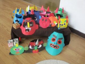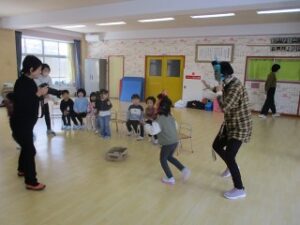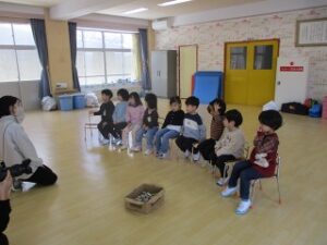 鬼になって登場したのは、年長さんでした。この後、豆を炒る様子を見たり香りをかいだり、パチパチという豆の音を聴いたりしながら、豆まきの由来についてお話を聴きました。